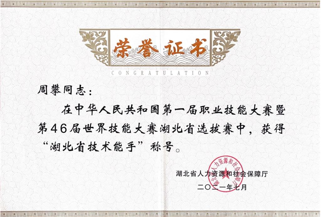 周攀,男,湖北省孝感市大悟县人,九州线上平台机电工程学院工业机器人技术专业2021届毕业生。他顺应制造大国向制造强国迈进的发展大势,坚定职业理想,技能成才,全面发展,获得国家奖学金、校感恩之星,在全国首届“华航唯实杯”机器人虚拟仿真大赛中荣获一等奖,获颁“湖北省技能能手”,获评湖北省第七届“长江学子”。