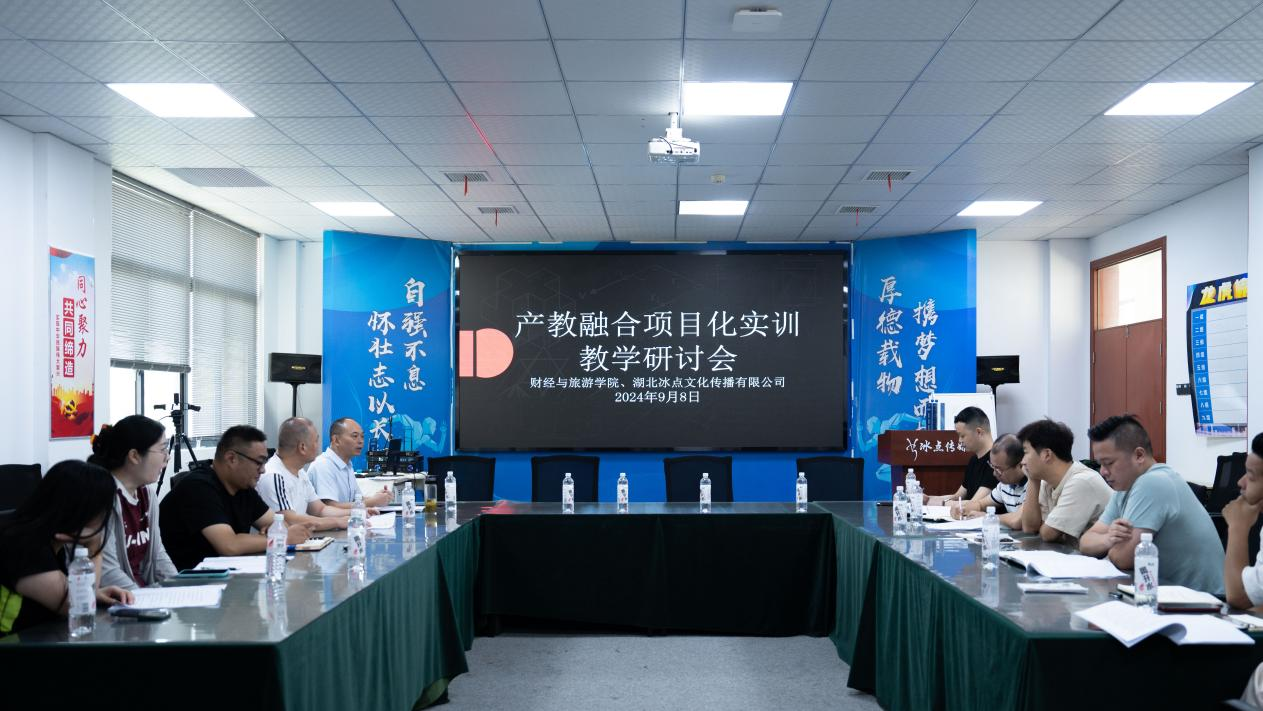 (本网讯 宋巍)9月8日上午,财经与旅游学院与湖北冰点文化传播有限公司在南区天工楼产教融合电商直播基地举办了一场产教融合项目化实训教学研讨会,财经与旅游学院院长徐斌华、副院长汪行光、电子商务教研室主任宋巍、专业教师代表宗敏、李媛以及湖北冰点文化传播有限公司代表熊传兵、晏磊等参加活动。此次研讨会旨在进一步推动产教深度融合,加快电商专业高质量发展,探索直播电商领域的教学创新与人才培养新模式。