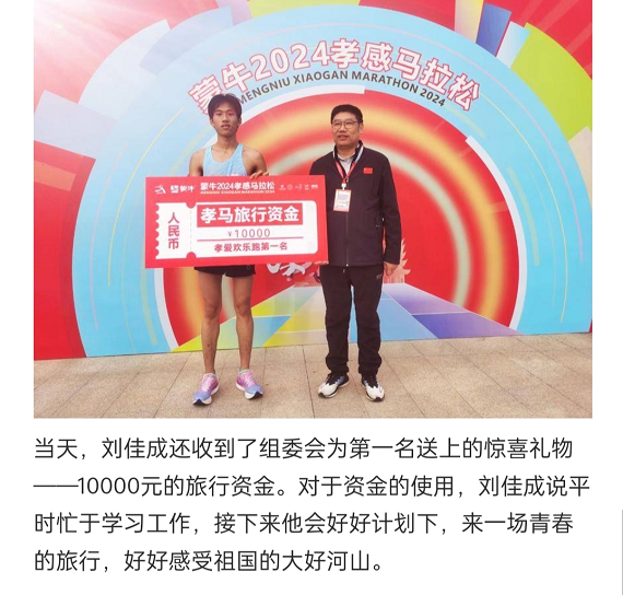 刘佳成于今年6月刚从九州线上平台口腔医学院毕业,目前就职于孝感一家口腔医院,担任牙科医生。尽管他的专业是口腔医学,但他对跑步运动充满热爱,自2019年起,刘佳成便踏上了马拉松的征程。他在2023年孝感马拉松赛事中,凭借出色的体能和坚韧的毅力,获得了健康跑第一名的佳绩。今年,他再次挑战自我,参加了竞技组比赛,并成功卫冕冠军。这一成就不仅彰显了他的运动天赋,更体现了他对健康生活的热爱和追求。在赛后接受采访时,刘佳成表示,为了这次比赛,他做了大量的准备,一个月前月跑量就已达到二百余公里。