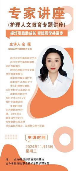 (本网讯 镇雪婷 张玉洁)近日,武汉大学中南医院护理部副主任张春华、护士长定薇应邀来护理学院为师生作护理人文教育系列专题讲座,同步开展了2025届护理实习生选拔工作。护理学院院长杨桂荣、副院长张玉洁、教学办相关人员及护理专业学生代表等参加了相关活动。专题讲座由张玉洁主持。