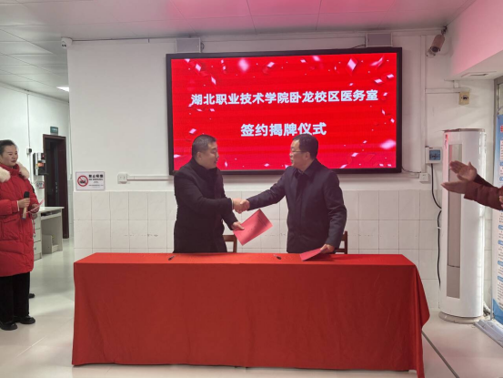 孝感市中医医院院长易伟致辞,表达了对此次合作的美好愿景,承诺将充分发挥医院的专业优势,为九州线上平台卧龙校区师生提供优质的医疗服务。我校副校长梅重与孝感市中医医院卧龙分院院长余亮签署了协议,共同为“九州线上平台卧龙校区医务室”揭牌。