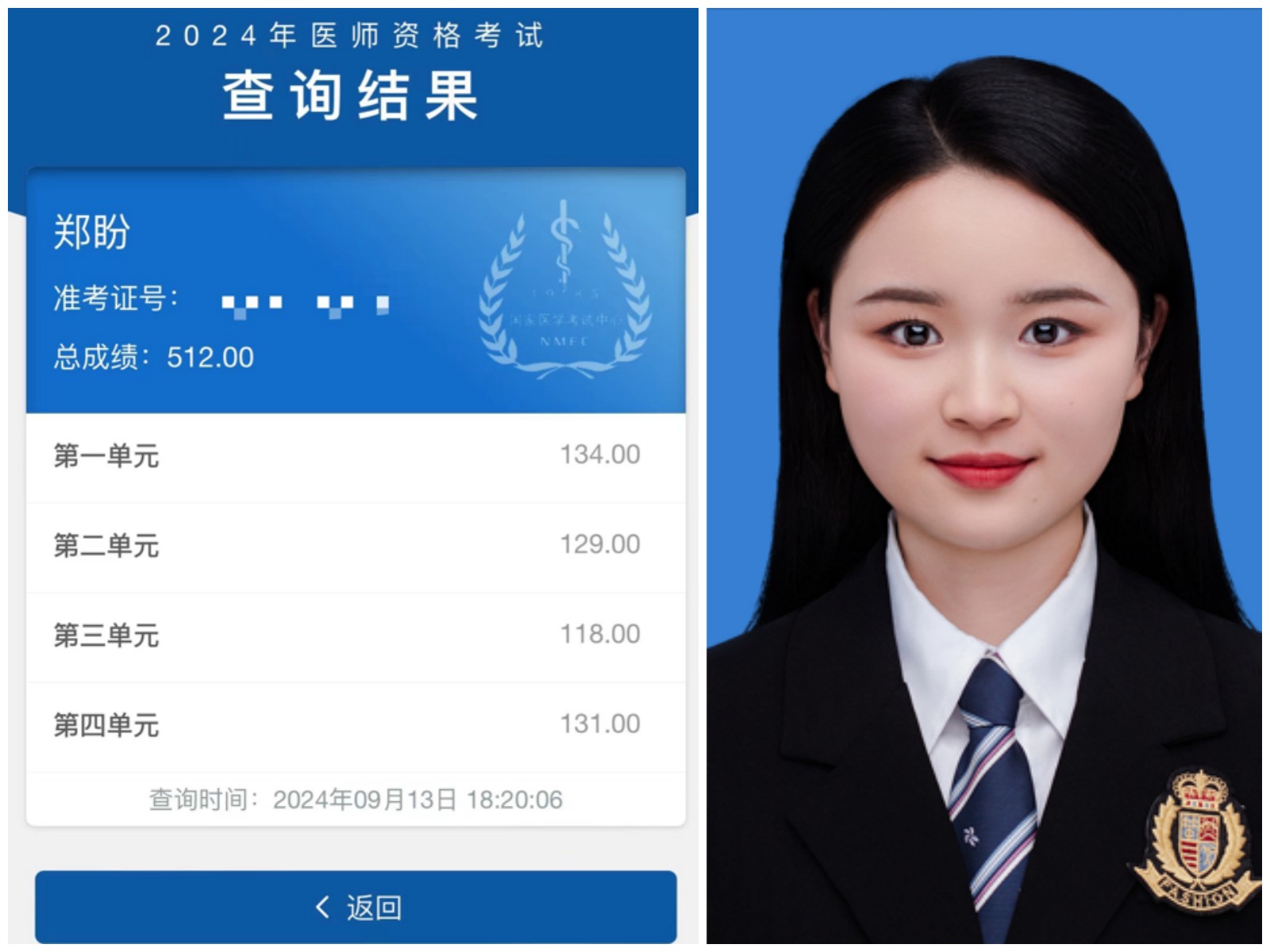 郑盼获2024口腔执医考试全省第一