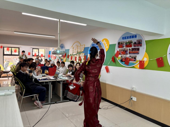 苗族学生刘萍以生动的语言讲述苗族苗年的历史与习俗,展现对自然的敬畏与对丰收的祈愿;土家族学生雷金讲解民族非物质文化遗产项目,土家织锦(西兰卡普)、土家摆手舞、土家山歌、梯玛歌等,领略“以歌养心、以舞传情”的精神。藏族学生牛金花跳起经典舞蹈《吉祥如意》,舞姿轻盈如云,尽显雪域儿女对幸福生活的礼赞,赢得现场阵阵掌声。