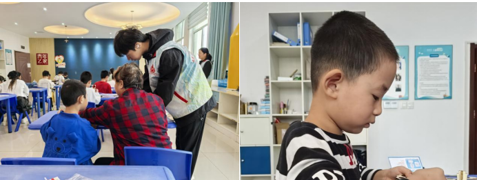 志愿者们通过简单易懂的讲解和手把手的示范,教孩子们制作创意手工作品——有的孩子跟着折出可爱的纸飞机,有的专注地粘贴五彩斑斓的贺卡,还有的发挥想象,给作品添加专属小装饰。