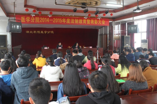11月11日下午,医学分院召开2014-2015年度法制教育暨表彰大会。邀请孝南区人民法院少年庭庭长何丽、新华街派出所指导员余华阳作专题讲座,分院全体班子成员、班主任及全体学生参加大会。会议由医学分院副院长雷天晓主持。